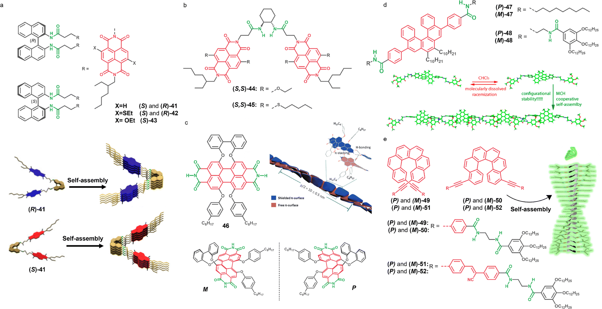 | Fig. 13 (a) Chemical structures of bichromophoric units with axially chiral binaphthyl units 41–43 and schematic representation of the self-assembly for bichromophoric units with binaphtyl axial pendants (S)- and (R)-41 (reproduced from ref. 199 with permission of Wiley-VCH GmbH, copyright 2020). (b) Chemical structure of bichromophoric units with axially chiral trans-1,2-bis(amido)cyclohexane moieties 44 and 45. (c) Chemical structure of core-substituted PBI 46 with a schematic representation of both M and P atropo-enantiomers M and P and a schematic representation for the aggregate of the enantiopure M atropo-enantiomer (reproduced from ref. 205 with permission of Wiley-VCH Verlag GmbH & Co. KGaA, Weinheim, copyright 2012). (d) Chemical structure of [5]helicenes 47 and 48 and a schematic representation of the aggregate of the former (M)-47 in MCH (reproduced from ref. 98 with permission of the American Chemical Society, copyright 2018).(e) Chemical structures of [6]helicenes 49, 50, 51, 52 and schematic representation of the self-assembled structure for 50 and 52 (reproduced from ref. 212 with permission from the Royal Society of Chemistry). | ||