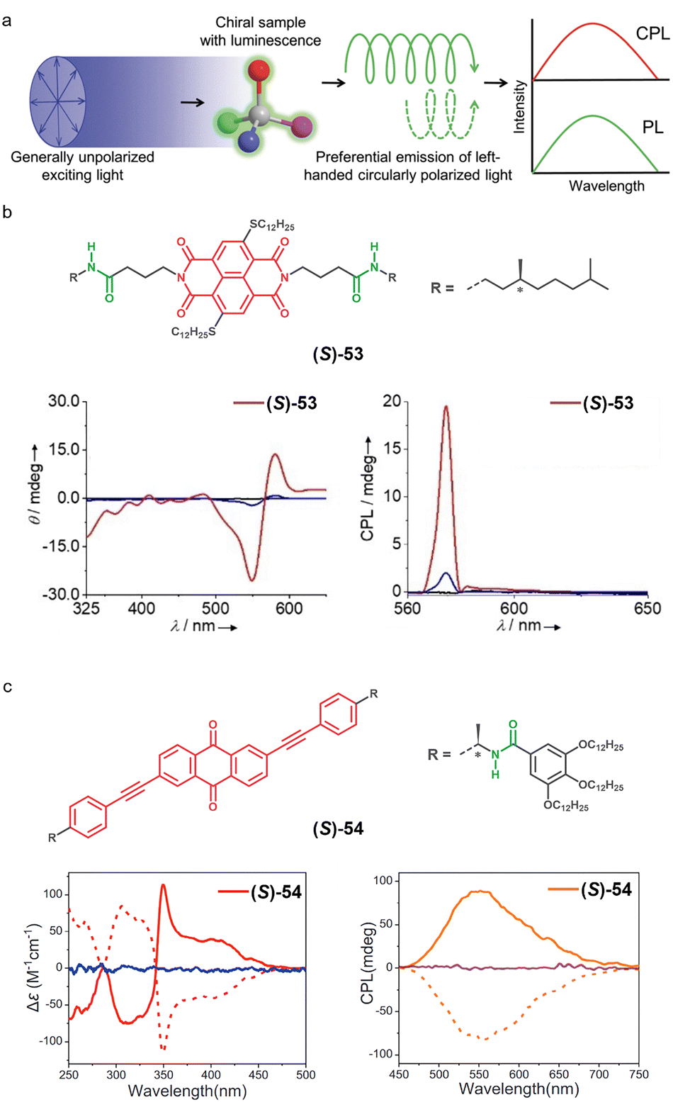 Fig. 14 (a) Schematic representation of the circularly polarized luminescence (CPL) phenomenon (reproduced from ref. 242 with permission of Wiley-VCH Verlag GmbH & Co. KGaA, Weinheim, copyright 2019). (b) Chemical structure of chiral sulfur-substituted naphtalene-diimide (S)-53 along with its CD and CPL spectra (red lines) in decane/THF (9 : 1) (c = 0.1 mM) (reproduced from ref. 252 with permission of Wiley-VCH Verlag GmbH & Co. KGaA, Weinheim, copyright 2020). (c) Chemical structure of chiral anthraquinone derivative (S)-54 along with its CD (red line) and CPL (λεx = 365 nm) (orange line) spectra in MCH (c = 20 mM) (reproduced from ref. 239 with permission of Wiley-VCH GmbH, copyright 2025). | ||
