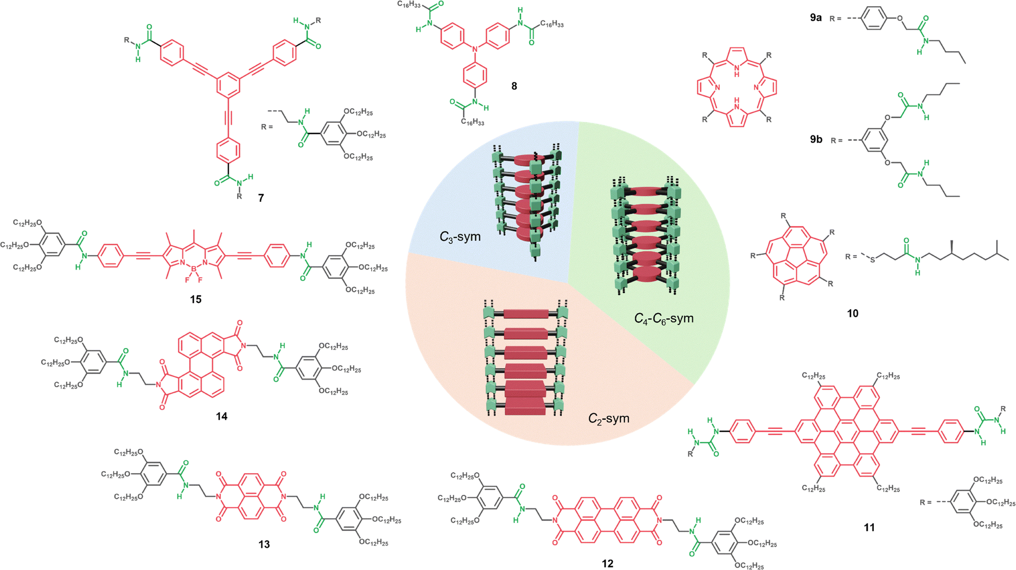 In many cases, the substitution pattern of the π-conjugated monomers is dictated by the shape of the chromophore as well as synthetic limitations. In this context, the design of linear π-conjugated monomers with C2 symmetry has been widely utilized in the field. Representative examples of C2-monomer designs leading to stacked 1D assemblies were reported using the rylene diimide derivatives, known for their highly conjugated aromatic cores and for their electron deficient nature.29,139 For example, Würthner34 and Shinkai140 reported PBI 12 and NDI 13, forming supramolecular polymers with excellent gelation properties in apolar solvents. More recently, Sánchez and coworkers reported the Z-shaped PBI 14.65 Remarkably, this unconventional molecular design leads to the formation of distinct aggregates, including a thermodynamically stable species that exhibits null exciton coupling. This so-called “null aggregate” is characterized by an absorption spectrum nearly identical to that of the monomer, but slightly red-shifted.