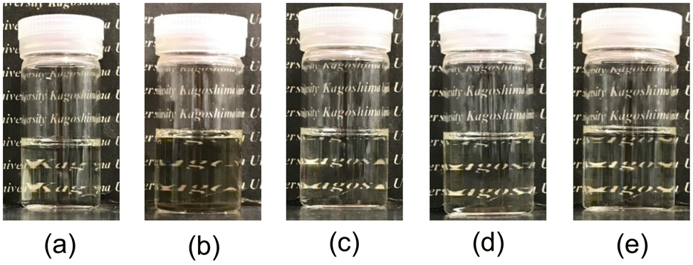 The intramolecular polycondensation of the dimethoxysilyl groups attached to the polymer chain of PGE–DS was performed by adding purified water, followed by stirring at 120 °C for 120 h (Scheme 1b). To isolate the product, the DMF solution was concentrated and reprecipitated from diethyl ether. The diethyl ether-insoluble fraction was then isolated by decantation and washed with diethyl ether. Finally, the product was dried under reduced pressure to yield PGE–PAMS. PGE–PAMS was soluble in water and in organic solvents such as DMSO, CH3OH, ethanol (C2H5OH), and isopropyl alcohol (iso-C3H7OH) (Fig. 1a–e), demonstrating its amphiphilic nature. Meanwhile, it was insoluble in organic solvents such as DMF, acetone, THF, chloroform, toluene and hexane.