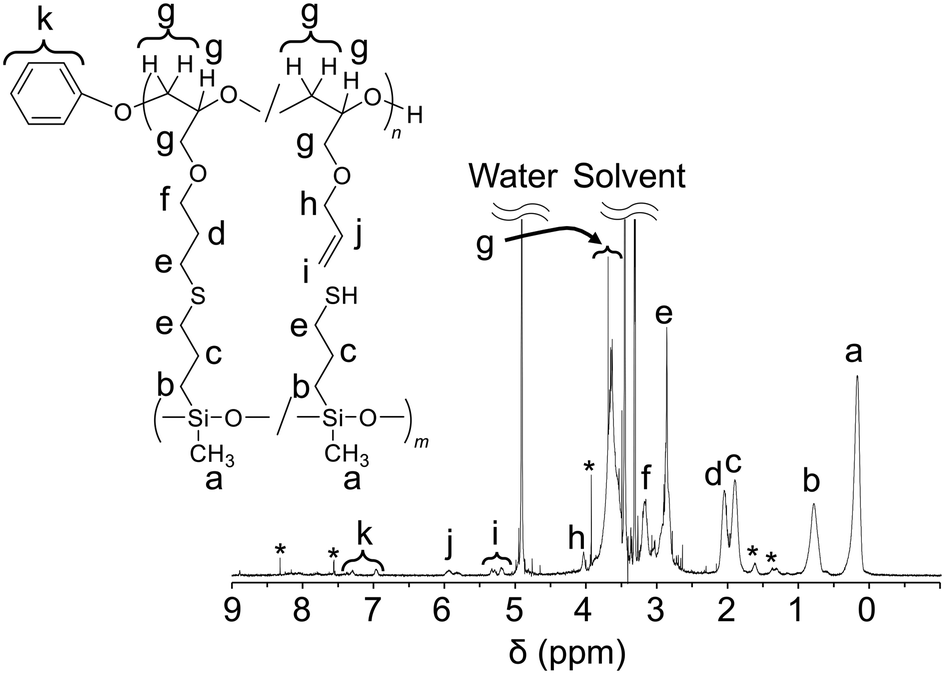 In the 1H NMR spectrum of PGE–PAMS in CD3OD, the signals attributed to the allyl groups (5.40–5.10 ppm) almost disappeared, indicating the progress of the thiol–ene reaction between MPDMMS and PAGE. Additionally, the average DP of the PAMS chain was estimated to be ca. 39.1 by calculating the integral ratio of signal k to signal b, which correspond to the phenolate-initiated end group and the methylene proton adjacent to the Si atom, respectively, in the 1H NMR spectrum (Fig. 2). Furthermore, the average DP of the PGE chain was ca. 36.4, of which 33.5 were units linked to PAMS chains and 2.9 were units with unreacted allyl groups, indicating that 8.0% of the PGE chains contained units with unreacted allyl groups. This was determined from the integral ratio of signal k to signals d and i, which are attributed to the phenolate-initiated end group, methylene protons and double bonds, respectively, in the 1H NMR spectrum (Fig. 2).