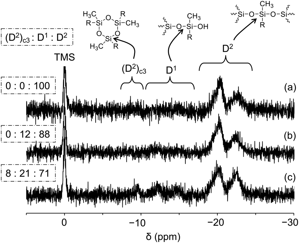 32, whereas no signals attributable to a D1 or D0 structure were detected (Fig. 3a). The predominance of the D2 structure indicates that sufficient polycondensation of the dimethoxysilyl groups in PGE–DS occurred, resulting in the formation of the Si–O–Si bond main chain.