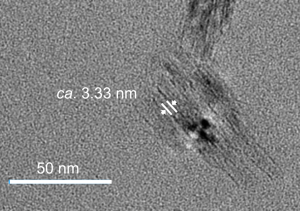 To examine the structure of PGE–PAMS, TEM measurements were performed. A droplet of an aqueous solution of PGE–PAMS was placed onto a TEM grid and dried without electron staining. The TEM image of the resulting sample revealed straight polymer chains arranged in parallel stripe patterns (Fig. 4), indicating that PGE–PAMS possesses a one-dimensional structure. The width of a single black-and-white stripe set was estimated to be ca. 3.33 nm. The black-and-white regions can be attributed to the inorganic PAMS components (Si-rich regions) and the organic PGE components (C-rich regions), respectively. On the basis of the molecular dimensions of a model compound representing the repeating unit of PGE–PAMS (Fig. 5a), the molecular width of PGE–PAMS was estimated to be ca. 1.76 nm. Accordingly, the stripe widths of ca. 3.33 nm observed in the TEM image suggest that the polymer chains are arranged in a regular pattern in which identical segments are aligned face-to-face (Fig. 5b).
