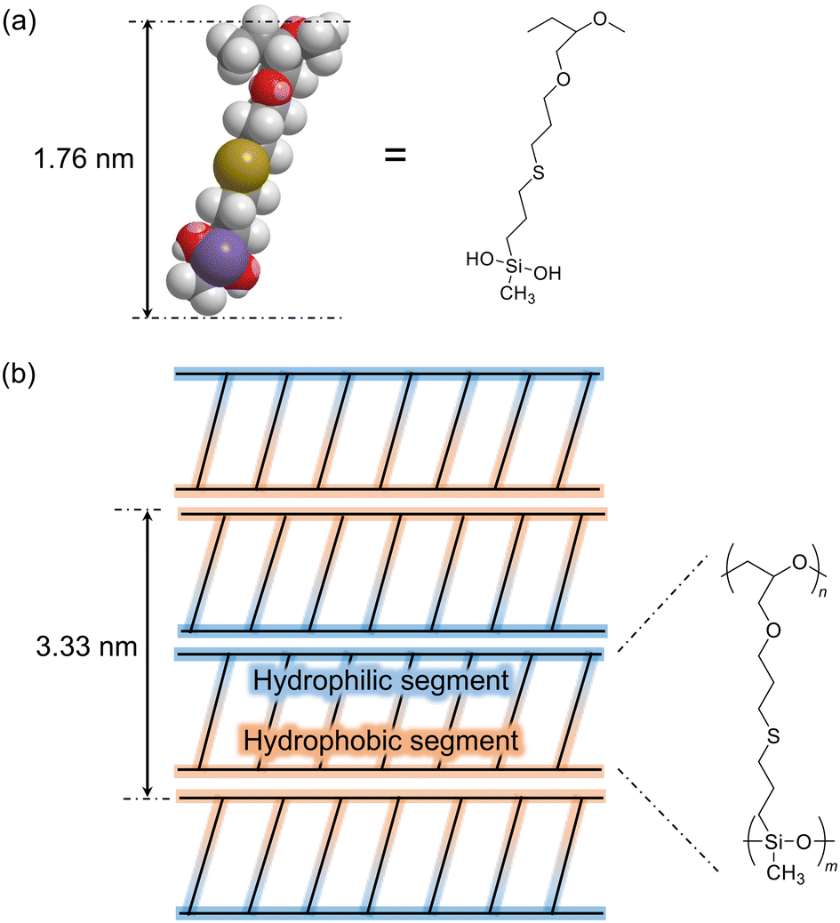 The results of the structural analysis of PGE–PAMS can be summarized as follows. Solubility tests in various solvents indicated the absence of intermolecular crosslinking in PGE–PAMS. The 1H NMR spectrum confirmed the successful thiol–ene reaction between MPDMMS and PAGE. The 29Si NMR spectra showed that the dimethyoxysilyl groups of PGE–DS underwent polycondensation to form the PAMS chains, although some units with mercapto group components were also present. The TEM image revealed that PGE–PAMS had a one-dimensional structure. Taken together, these results suggest that PGE–PAMS exhibits a ladder-like structure consisting of PGE and PAMS chains linked in parallel by sulfide bonds, as illustrated in Fig. 6.