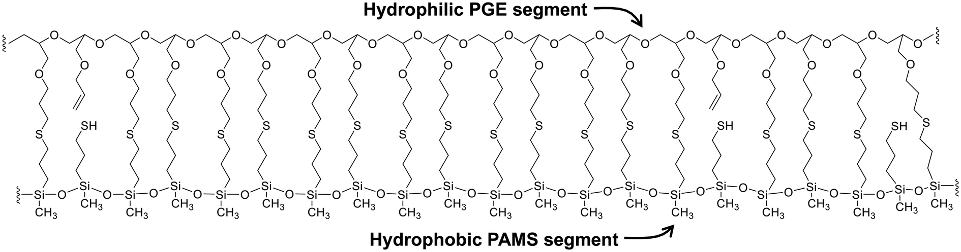Since the repeating unit length of the PAMS chain, which consists of two main atoms (Si–O), is shorter than that of the PGE chain, which has three main atoms (C–C–O), introduction of mercapto-containing units in the PAMS chain most likely helps balance the chain lengths between PGE and PAMS, thereby alleviating strain. From an alternative perspective, the strain might also be alleviated by the long crosslinking units even without the introduction of MPDMMS. However, in such a case, it is speculated that the molecular chains would curve rather than straighten due to the mismatch in the repeating unit lengths of the PAMS and PGE chains. As evidenced by TEM observations (Fig. 4), described in detail below, the molecular chains are straight, suggesting that the introduction of MPDMMS plausibly explains this outcome.