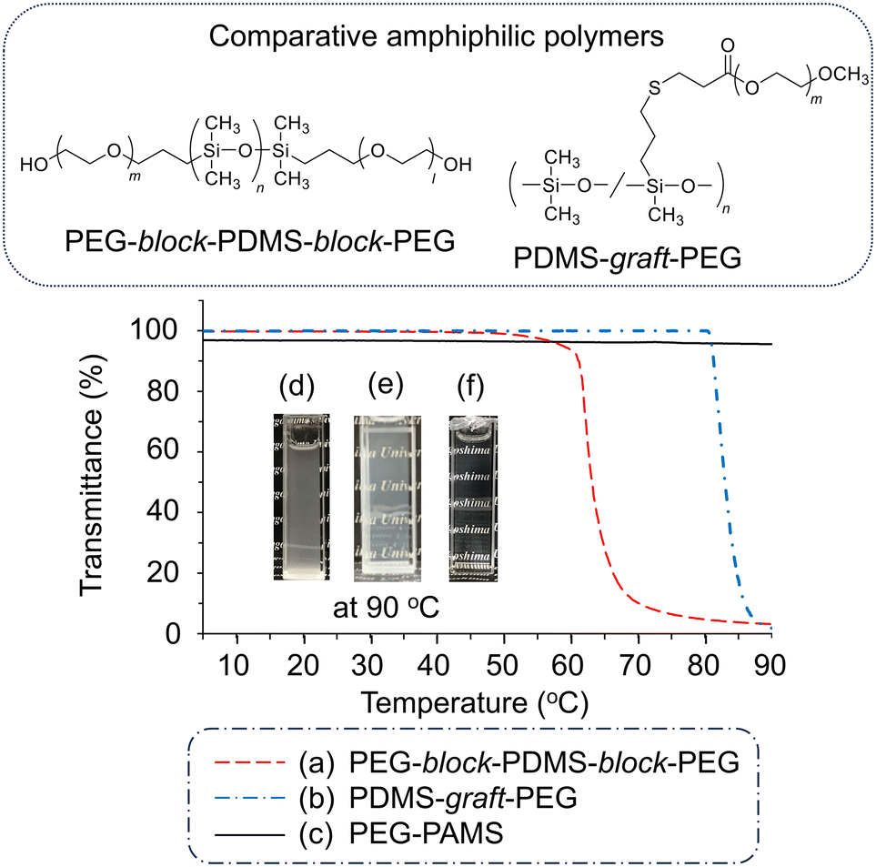 The transmittances of the aqueous solutions of PEG-block-PDMS-block-PEG and PDMS-graft-PEG sharply decreased at 61 °C and 81 °C, respectively (Fig. 8a and b). Visual observation also confirmed that these aqueous solutions became cloudy at 90 °C (Fig. 8d and e). These findings suggest the formation of large aggregates above these temperatures, indicating that block and graft copolymers containing PDMS and PEG components have the Tc of 61 °C and 81 °C. In contrast, the transmittance of the PGE–PAMS aqueous solution did not decrease upon heating to 90 °C (Fig. 8c). Visual observation revealed that the PGE–PAMS solution remained transparent at 90 °C, without the formation of turbidity or a precipitate (Fig. 8f), indicating that the nanoaggregates remained stable even at high temperatures.