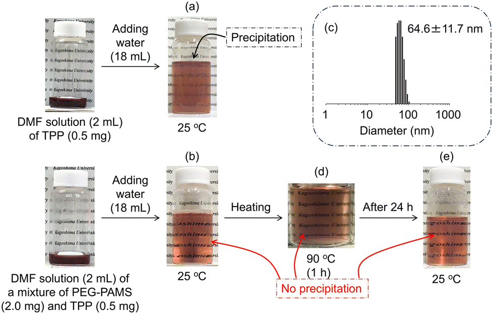 In addition, to investigate whether the solubilized state of TPP could be maintained at high temperatures, the mixed solution of PGE–PAMS and TPP was heated to 90 °C, and it was found that no precipitate was formed (Fig. 9d). This suggests that TPP was stably encapsulated within the PGE–PAMS nanoaggregates even at 90 °C, since the collapse or aggregation of the nanoaggregates would cause the precipitation of either TPP or PGE–PAMS from the mixed solution. Additionally, after being left at room temperature for 24 h, no precipitate was observed, confirming that TPP remained solubilized (Fig. 9e).