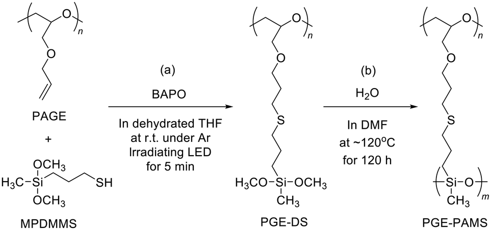First, the thiol–ene reaction of MPDMMS with PAGE was performed using phenylbis(2,4,6-trimethylbenzoyl)phosphine oxide (BAPO) as a photoradical initiator in dehydrated THF, resulting in poly(glycidyl ether) containing dimethoxysilyl groups as side chains (PGE–DS, Scheme 1a). To confirm the progress of the thiol–ene reaction, we attempted to isolate the solid product via reprecipitation. However, the reprecipitated product was insoluble in any solvent. The cause of insolubility is believed to be the partial hydrolysis of the diethoxysilyl groups, which leads to intermolecular dehydration condensation involving the formed silanol groups, resulting in the formation of intermolecular crosslinking. Therefore, after completing the reaction, a large amount of DMF was added to the reaction solution to prepare a dilute solution (1.0 × 10−3 mol unit per L) without isolating the product. To avoid the intermolecular reaction between the dimethoxysilyl groups in PGE–DS side chains, which should react only intramolecularly, the solution concentration was reduced during the subsequent polycondensation.