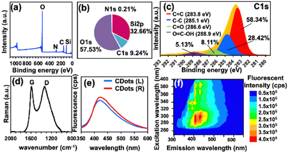 X-ray photoelectron spectroscopy (XPS) was used to investigate the chemical compositions and structure of the CDots@SNHs. The spectra show four predominant peaks corresponding to 9.24% carbon (C1s), 0.21% nitrogen (N1s), 57.53% of oxygen (O1s), and 32.66% Si (Si2p) (Fig. 3(a) and (b)). As shown in Fig. 3(c), the deconvolution of the high-resolution analysis of the C1s peak indicates contributions at 283.8 eV (58.34%) assigned to sp2 graphitic structures in CDots@SNHs, along with peaks at 285.1 eV (28.42%), 286.6 eV (8.11%), 288.9 eV (5.13%) corresponding to C–C, CO and O