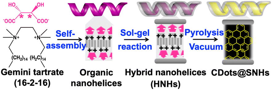 Self-organised helical bilayers of dicationic gemini surfactants confined in helical silica nanospace were transformed in situ to carbon dots (CDots) via pyrolysis. These water-dispersible CDots exhibit electronic absorption spanning the UV and visible range and possess symmetrical circular dichroism (CD) signals, the sign of which depends on the handedness of the helices.
