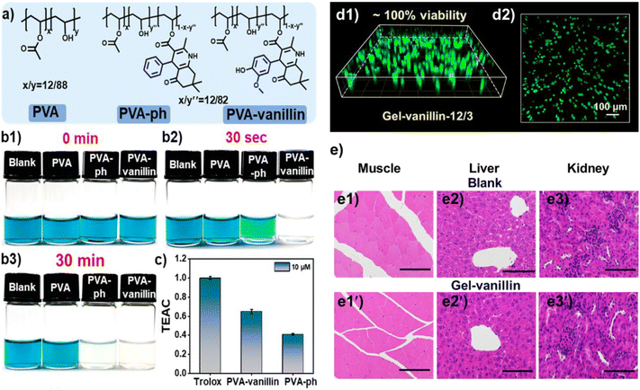 Fig. 15 (a) Polymers used in the radical-scavenging test. (b1–b3) Color change of ABTS˙+ solutions in the presence of PVA, PVA-ph, and PVA-vanillin. (c) Trolox equivalent antioxidant capacity (TEAC) values of PVA derivatives. Trolox served as a standard compound (1.0). (d1) FDA/PI staining of cells in Gel-vanillin; (d2) cell observation of Gel-vanillin from the top. (e) Pathological analyses using H&E staining (400×); sections of muscle tissues around the gel (e1 and e1′), liver (e2 and e2′); and kidneys (e3 and e3′) from healthy mice (blank, e1–e3) and mice injected with gels (Gel-vanillin, e1′–e3′). Data are presented as mean ± SD, n = 6. Reprinted with permission from ref. 62. Copyright 2023, American Chemical Society.