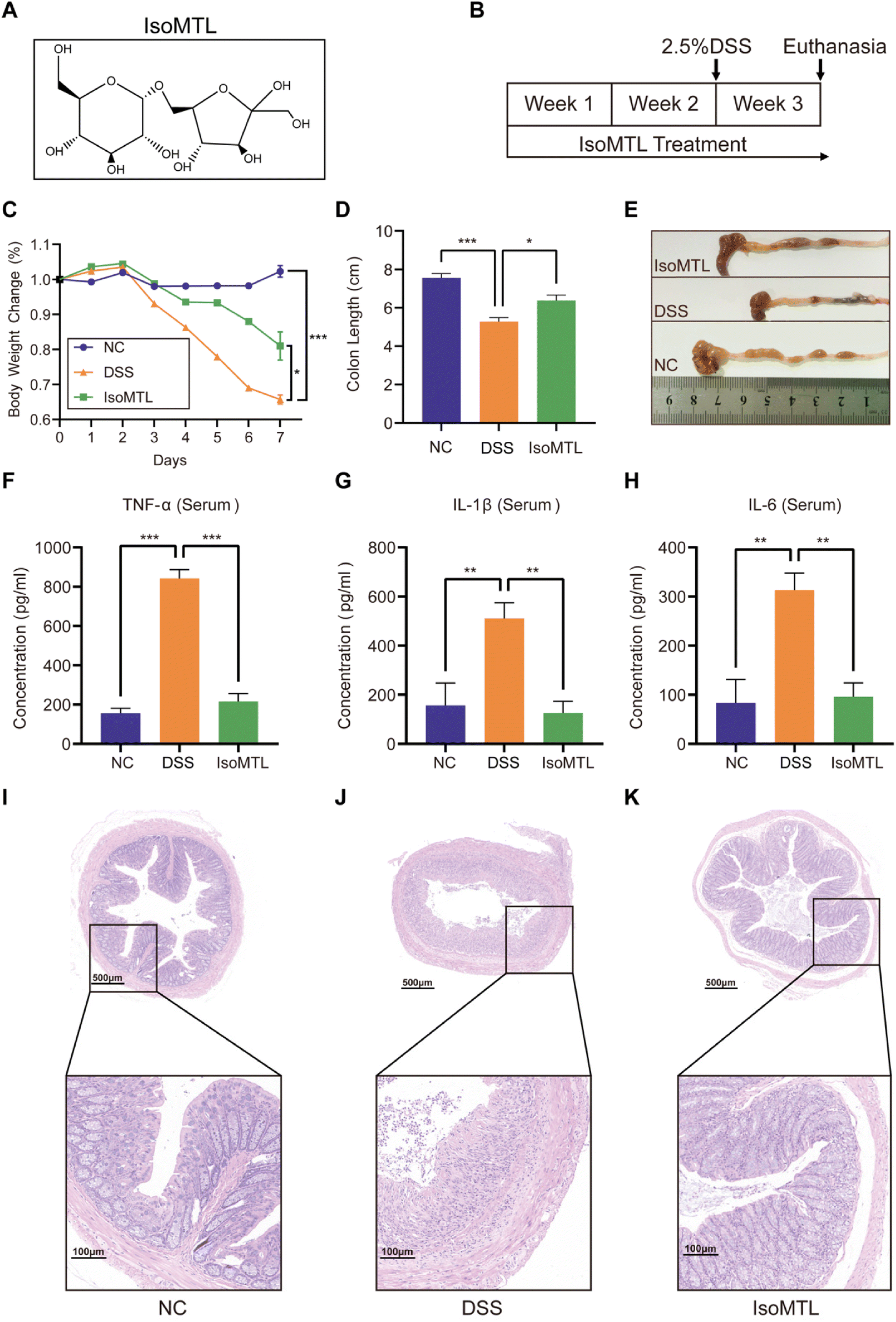 | Fig. 1 Isomaltulose effectively ameliorated clinical symptoms of DSS-induced colitis in mice. (A) The chemical structure of isomaltulose. (B) Experimental design flow diagram. IsoMTL treatment: isomaltulose (400 mg per kg per day). (C) The body weight changes (n = 6). (D and E) Length of colons. The levels of TNF-α (F), IL-1β (G) and IL-6 (H) in serum (n = 6) were determined using ELISA. (I–K) H&E-stained colon tissue. Compared to the indicated group, *P < 0.05, **P < 0.01 and ***P < 0.001. | |