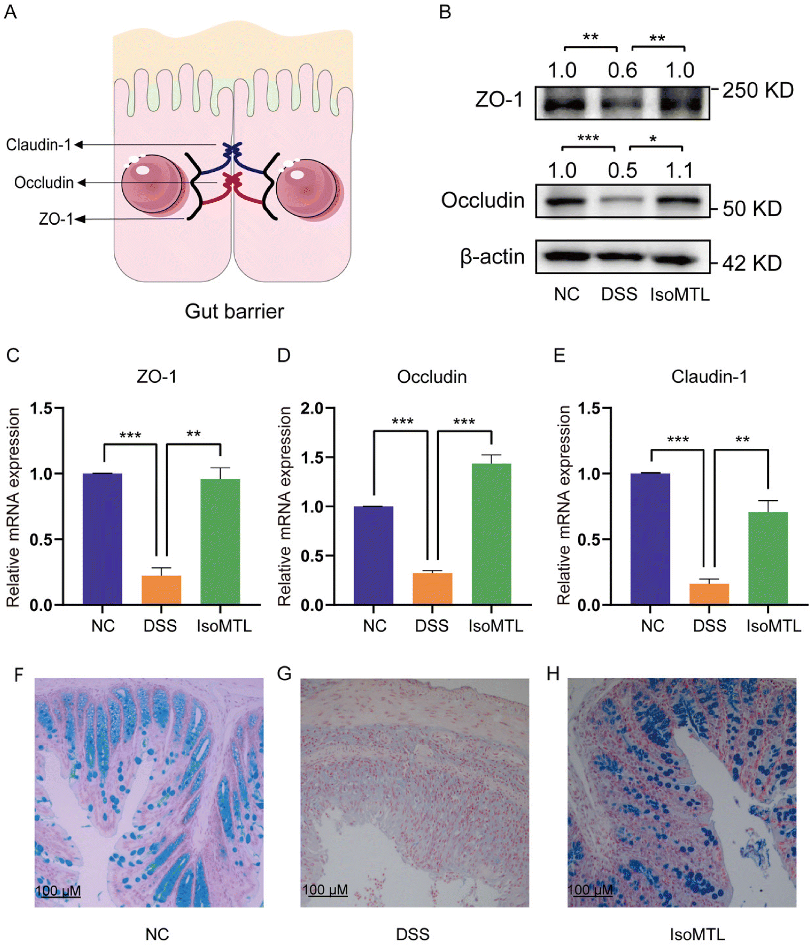 The major tight junction proteins ZO-1, occludin, and claudin-1 of the intestinal epithelium involved in mucosal healing form an important barrier in the gut, preventing the spread of potentially harmful pathogens and toxins19 (Fig. 2A). Therefore, to determine the regulatory role of isomaltulose in intestinal tight junction proteins, we measured the expression of major tight junction proteins using western blot (Fig. 2B) and RT-qPCR (Fig. 2C–E). As shown in Fig. 2B, isomaltulose significantly increased the protein expression of ZO-1 (P < 0.01) and occludin (P < 0.05). Meanwhile, isomaltulose restored the gene transcript levels of ZO-1 (P < 0.01), occludin (P < 0.001) and claudin-1 (P < 0.01) that were decreased by DSS (Fig. 2C–E).