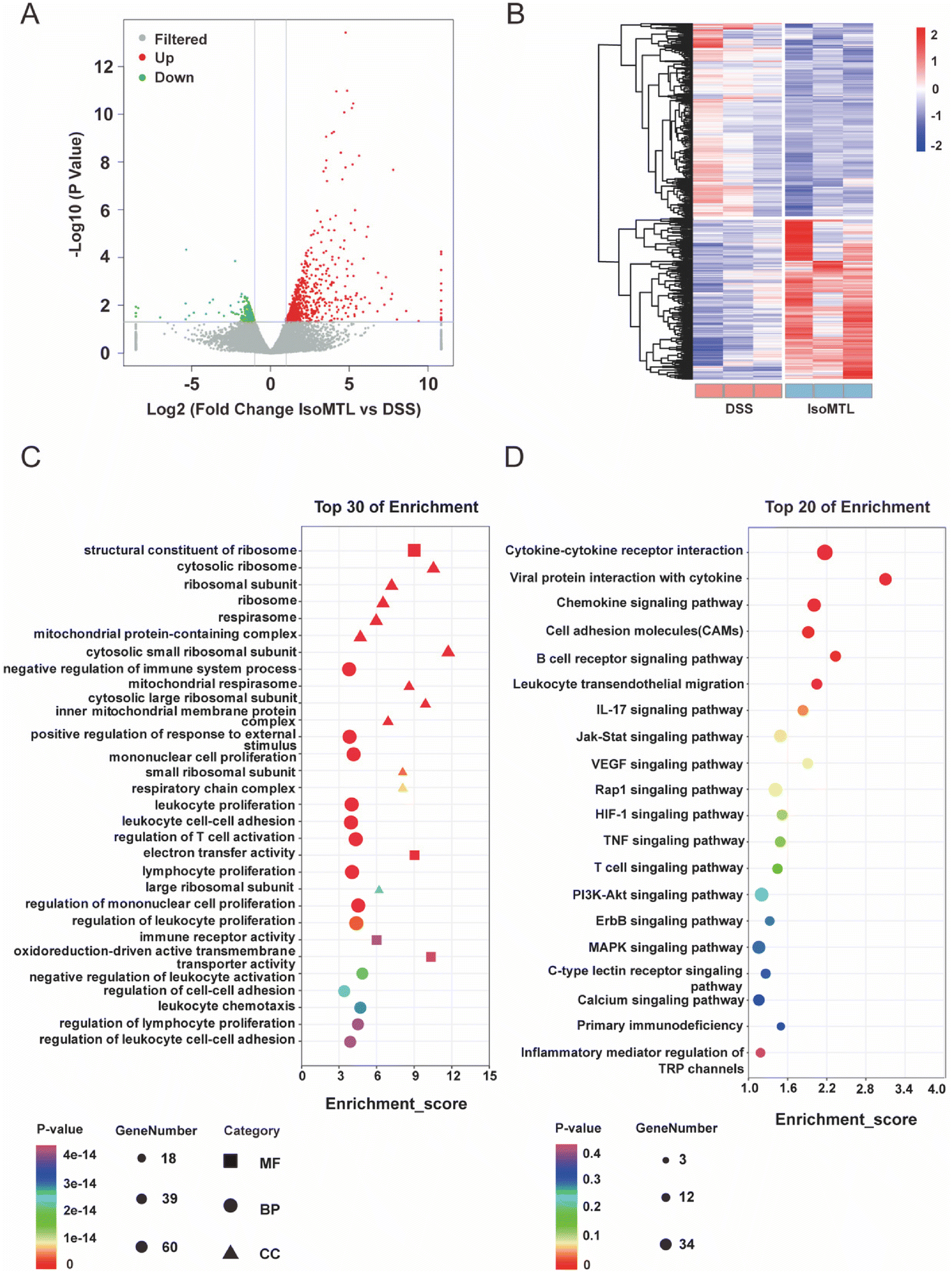 | Fig. 3 Enrichment analysis and deferentially expressed genes. (A) Volcano map of DEGs between isomaltulose and DSS. Red represents up-regulated genes and green represents down-regulated genes. (B) The expression profiles of DEGs. The transition from high to low expression is represented by the red to blue colors. (C) Top 30 enrichment was displayed using GO analysis. (D) KEGG pathway enrichment analysis of top 20 immune related pathways. GO and KEGG enrichment analysis were selected according to the rank of q-value. | |