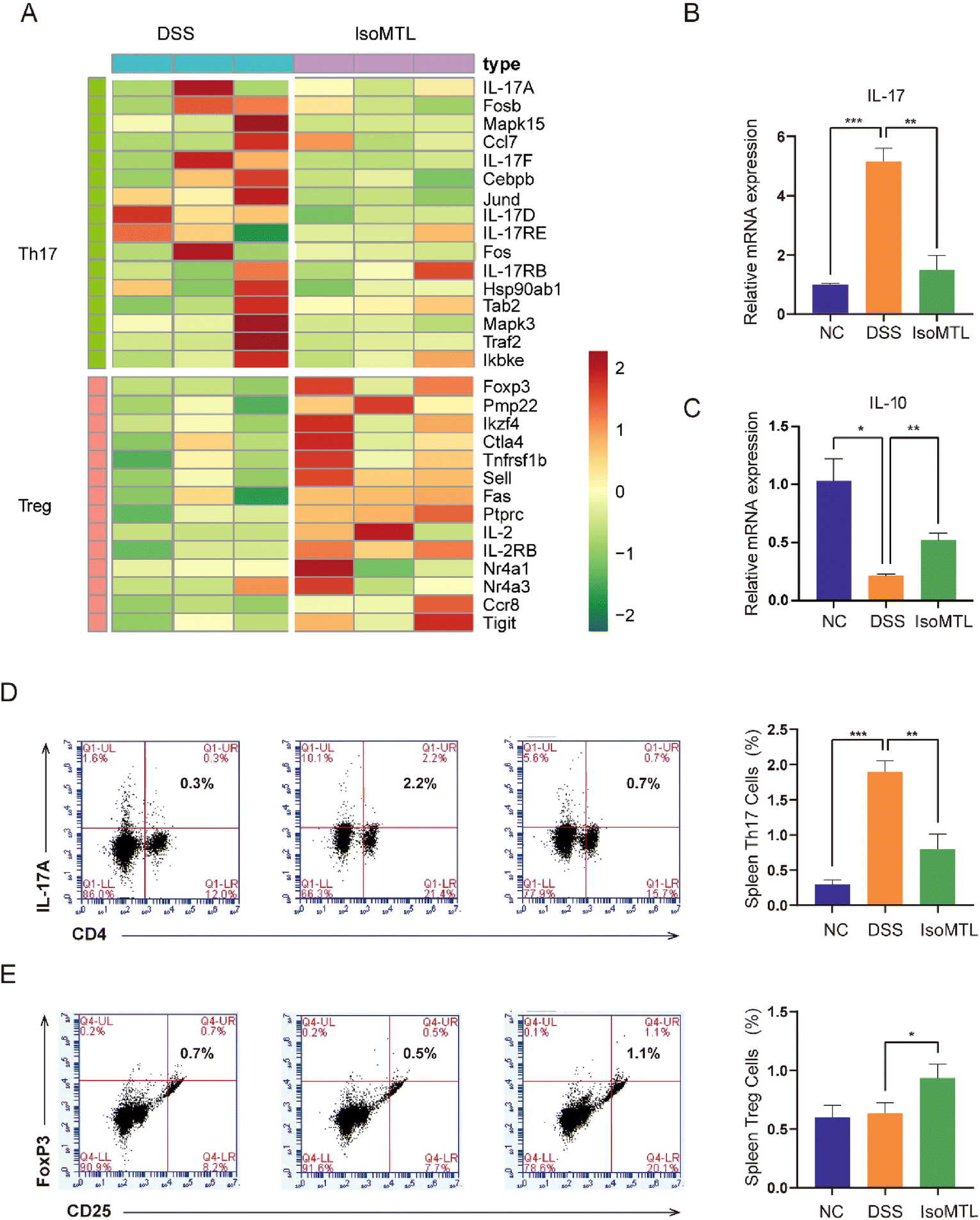 | Fig. 4 Isomaltulose improves the DSS-disturbed balance between Th17 and Treg cells. (A) Expression pattern of DEGs in Th17 and Treg signaling pathways. The transition from high to low expression is represented by the red to green colors. The mRNA expression of IL-17 (B) and IL-10 (C) in colon tissues. Flow cytometry analysis of (D) CD3+CD4+IL-17A+ Th17 cells and (E) CD3+CD4+CD25+FoxP3+ Treg cells. *P < 0.05, **P < 0.01, ***P < 0.001. | |