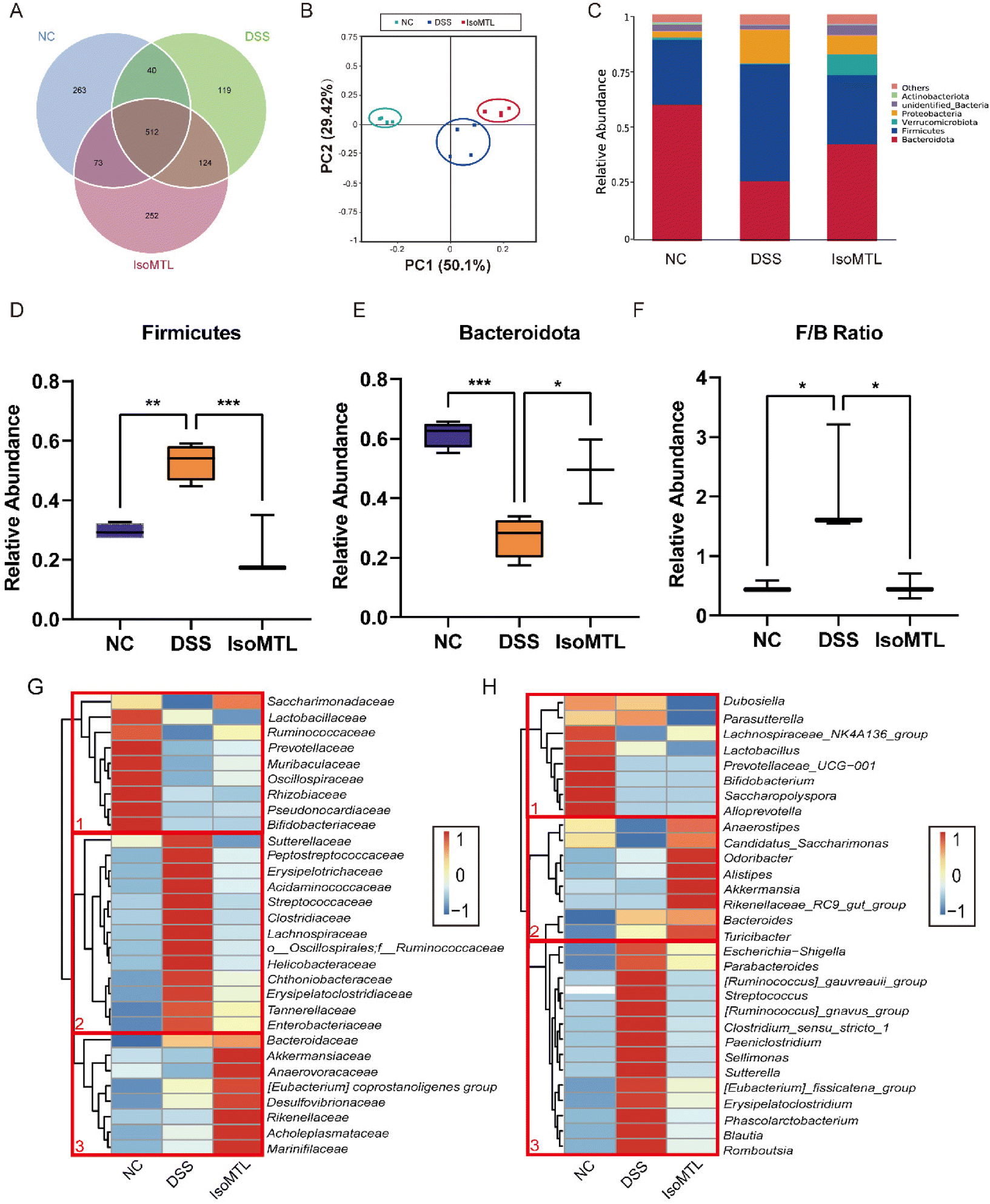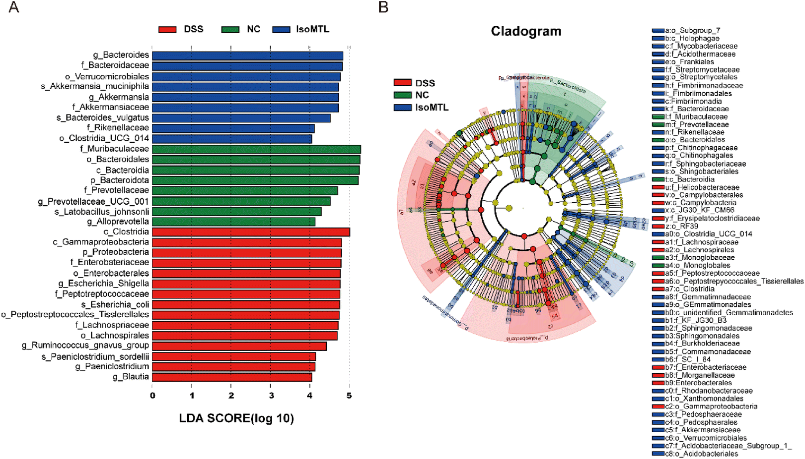 The LEfSe method was used to analyze the difference between the samples, which could further show the microbial diversity (Fig. 6A and B). The larger the LDA score, the greater the influence of species abundance on the difference effect. Setting LDA score >2 and P < 0.05 as a meaningful cut-off, LEfSe identified 32 bacterial taxa which were significantly different between the three groups and could represent typical characteristics of different groups. As Fig. 6A shows, the DSS group had 15 dominant microorganisms, while the IsoMTL group had the other 9 dominant microorganisms, including families Bacteroidaceae, genus Bacteroides and phylum Gemmatimonadetes, etc., which was also verified by the differential-abundance microbial cladogram (Fig. 6B). Thus, LEfSe analysis illustrated that multiple taxonomic differences were found among three groups of DSS, NC and IsoMTL.