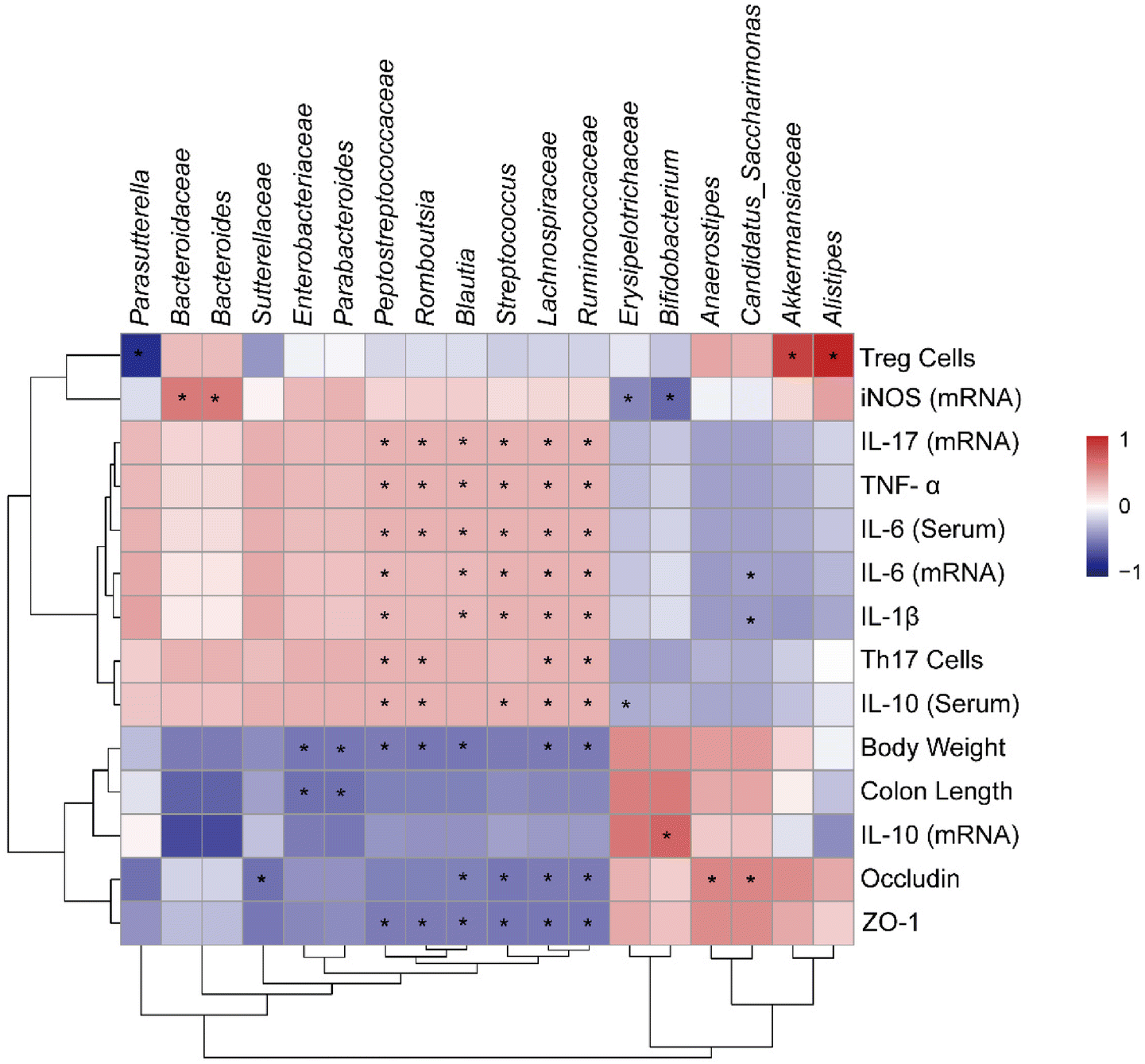 Correlation analysis can be used to verify the correlation between different data, so we used Spearman correlation analysis to examine the relationship between inflammatory factors and gut microbiota. Based on our results, inflammatory factors (TNF-α, IL-6, IL-17 and IL-1β) and tight junction proteins (ZO-1 and occludin) were highly correlated with changes in gut microbiota. As shown in Fig. 7, genus of Peptostreptococcaceae, Romboutsia, Blautia, Streptococcus, Lachnospiraceae and Ruminococcaceae showed a significantly positive correlation with inflammation factors and displayed a negative correlation with tight junction proteins. Meanwhile, the presence of Enterobacteriaceae and Parabacteroides significantly reduced the body weight and colon length. Notably, Akkermansiaceae and Alistipes were significantly positively correlated with Treg cells, while Parasutterella was significantly negatively correlated. Besides, there was a significantly positive correlation between the abundance of Bacteroidaceae and Bacteroides with the level of iNOS. These results clearly reveal the relationship between changes in different bacteria and host biological effects, indicating that changes in the gut microbiota are closely associated with inflammatory responses, especially tight junction proteins.