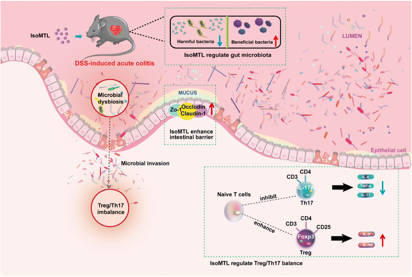 Isomaltulose is an isomer of sucrose27 derived from natural sources such as honey (<1%) and sugarcane,28 whose sweetness is approximately half that of sucrose (0.4–0.45).29 We previously developed engineered yeast to obtain high-purity isomaltulose.13 In healthy and obese patients, isomaltulose supplementation had been reported to reduce insulin resistance and elevated blood pressure, while benefiting endothelial function and cardiovascular health.30,31 Herein, we further indicated that isomaltulose supplementation was significantly effective in improving the prevention of acute colitis in mice, promoting colonic epithelial barrier integrity, reducing inflammatory cytokines, modulating gut microbiota and ameliorating Treg/Th17 balance (Fig. 8). These results suggest that isomaltulose is a promising therapeutic agent for the prevention and adjuvant treatment of UC by maintaining intestinal homeostasis.