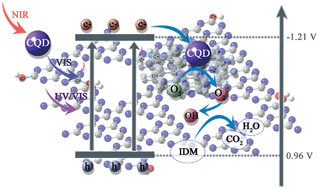 The development of facile and environmentally compatible synthetic strategies for broad-spectrum response photocatalysts is a primary goal for researchers in this area. For this study, we report on a template-free thermal treatment strategy for the synthesis of an oxygen-containing ultrathin porous carbon quantum dots/polymeric carbon nitride metal-free composites (CQD/OUPCN). Morphology characterization revealed that the thermal treatment induced bulk CQD/g-C3N4 (CQD/BCN) to transform to porous ultrathin 2D nanosheets with a high specific surface area. Chemical structure characterization revealed that O atoms were involved in the chemical composition of C3N4 following the introduction of CQD and subsequent thermal treatment. Optical and electrical characterization, as well as density functional theory (DFT) calculations, confirmed that the introduction of O atoms and CQD enabled the tuning of the intrinsic electronic state, and improved the charge transfer capacity of C3N4. Together with the up-converted fluorescence properties of CQD, the CQD/OUPCN exhibited remarkable broad-spectrum activity toward the degradation of PPCPs. Under visible light irradiation, the CQD/OUPCN-0.5% showed an 18.5 fold higher indomethacin (IDM) degradation rate than did g-C3N4. Further kinetics studies, including reactive species (RS) and degradation intermediate detection, indicated that RS, particularly O2˙−, was generated during the photocatalytic process, which could lead to the decomposition, and finally mineralization of IDM.