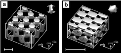 | Fig. 5 Calculated constant intensity surfaces in four-beam laser interference patterns designed to produce photonic crystals. The primitive basis is shown in each case. (a) FCC pattern with lattice constant 922 nm. The close-packed layers are shown on one side of the cube. (b) FCC pattern with lattice constant 397 nm. Scale bars: 500 nm. (Reproduced with permission from ref. 67.) | ||