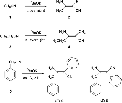 The cross-condensation of benzonitrile (7a) with 1 under solvent-free conditions gave 8a in 70% yield. The same cross-condensation of 7a and 7b with 5 gave 9a and 9b in 70 and 62% yields, respectively. In all reactions, no (Z)-isomer was produced.