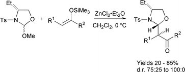 Ytterbium triflate has been used to catalyse the addition of chiral silyl ketene aminals to imines and the diastereomeric ratio was found to be dependent upon the structure of the imine.185 A similar reaction has also been carried out under Mannich-type conditions.186 Glycosyl bromides have been used to activate Schiff bases to nucleophilic attack of silylketene acetals.187 Good yields were obtained but with moderate levels of diastereoselectivity (dr generally 3 ∶ 1) which was shown to be due to E to Z isomerisation of the C