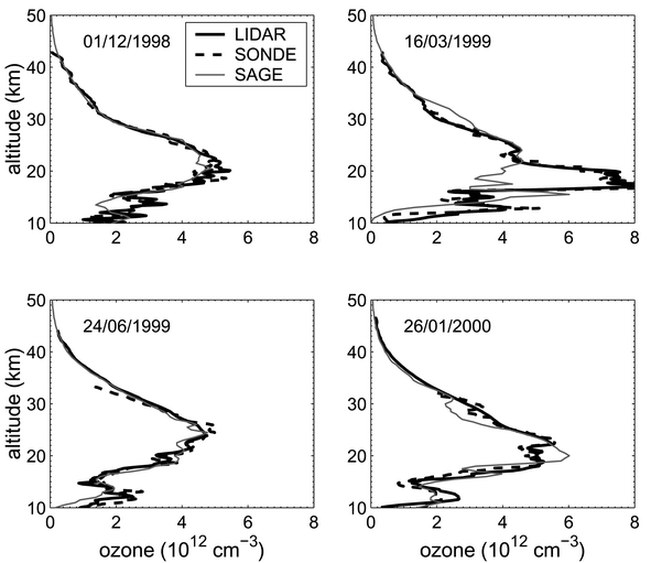 DIAL stratospheric ozone measurements at OHP have been compared to ECC ozone soundings performed at the same location and to SAGE II satellite measurements obtained in the vicinity of the station.39 As an example, Fig. 8 shows the comparison of ozone measurements obtained by the 3 instruments within less than 12 h difference. The SAGE II measurements were selected within ±2.5° latitude and ±10° longitude ranges around the station. The figure shows that when the measurements are sufficiently close in time, the lidar captures similar structures in the ozone profile as the more vertically resolved ECC sondes, with quite good agreement between both measurements. The agreement with the SAGE II measurements is also satisfactory in the middle and high stratosphere. Measurements obtained on March 16, 1999 are particularly interesting since both the ECC sonde and the lidar sampled polar air masses extending to the OHP location. The ozone number density measured around 20 km is very large as compared to values obtained in previous winters during the same period. The 1998/1999 Arctic winter was indeed very warm as compared to previous years, with nearly no chemical ozone loss within the vortex. The SAGE II measurement located around 10° west from OHP did not catch the tongue of polar air and showed much lower ozone amounts.