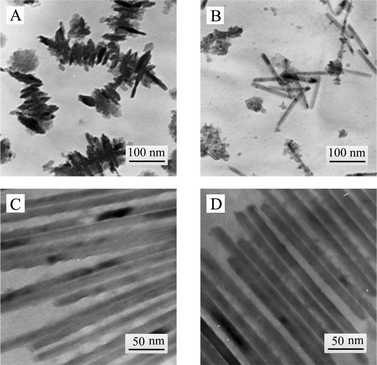 | Fig. 3 Nucleation and growth of Te nanorods after being aged at room temperature for (A) 10 min, (B) 30 min, (C) 3 h and (D) 12 h, respectively. In this reaction system, 20 mM (NH4)2TeS4 and 0.1 g of NaDDBS were contained. | ||