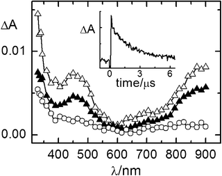 | Fig. 4 Time-resolved absorption spectra of the DCA (2.0 × 10−4 M)/biphenyl (0.2 M)/1c (1.0 × 10−2 M) system in air-equilibrated CH3CN recorded 0.32 (△), 1.9 (▲), 6.3 (○) μs after the laser pulse. λexc = 355 nm. Inset: decay kinetics recorded at 450 nm. | ||