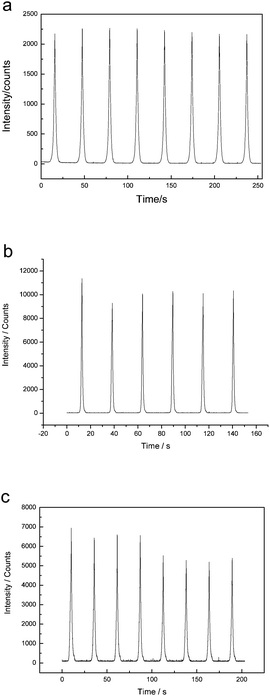 Fig. 5 shows the ECL emission of ZnO nanospheres, ZnO nanosphere/CdS nanorod and ZnO nanosphere/CdS nanoparticle in 0.1 M KOH and 0.1 M K2S2O8 aqueous solution containing 0.1 M KCl as the supporting electrolyte. The electrode potential was cycled between 0.1 and −1.5 V at a scan rate of 100 mV s−1. The ECL light emissions of the crystals all show quite good stability and enhanced intensity. As shown in Fig. 5, the ECL intensities of the two ZnO/CdS composites are both higher than that of pure ZnO nanospheres, which imply that surface coating could enhance the ECL intensity of ZnO nanospheres. It is interesting that the ECL intensity of ZnO nanosphere/CdS nanorod composite is higher than that of ZnO nanosphere/CdS nanoparticle composite. As proved previously, the ECL emission is much more sensitive to their surface electronic structure than the PL, and is dependent on the surface properties and the presence of surface defects.39,40 We assume that the ZnO nanosphere/CdS nanorod structure would possess more defects due to the faster crystal formation which might result in higher ECL intensity. These results could indicate that ECL properties are closely related to the structure of these nanocrystals. Therefore, more detailed investigation on ECL of these prepared core/shell semiconductor nanocrystals to find the relationship between structure and ECL emission is urgently needed and still in progress. The optical measurement conditions need to be optimized in further work to improve the stability of ECL signals.