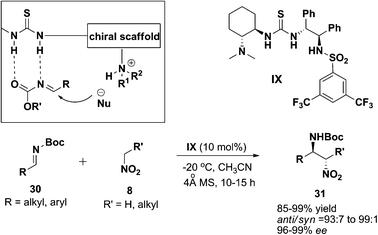 Although much work has been done for nitro-Mannich (or aza-Henry) reactions,33 it was not until Wang et al. documented a highly enantioselective and diastereoselective protocol for the synthesis of β-nitro amines 31 (Scheme 8). The bifunctional amine-thiourea IX bearing an extra hydrogen bonding donor at the sulphonamide part34 (NH2SO2Ar) appeared to exhibit excellent catalytic performance for the transformation at low temperature. To further expand the work on cinchona alkaloid derived amine-thiourea, Deng's group has studied an 1,2-addition approach towards biological interesting β-amino acids under a rather mild, moisture and air-compatible condition (Scheme 9).35 The generality of the reaction was subsequently investigated. A wide range of alkyl and aryl substituted malonates 2 were employed as nucleophiles, and good yields (55–99%) and excellent enantioselectivities (88–99% ee) were attainable. Around the same time, Dixon and co-workers published a similar work on Mannich reaction regarding the synthesis of β-amino esters 36 (Scheme 10).36 The synthesis was catalyzed by a cinchonine modified bifunctional thiourea and the decarboxylation reaction was carried out in a simple procedure.