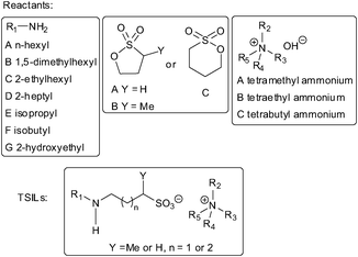 Combinatorial chemistry and click chemistry have been applied to synthesize sixty-three kinds of TSILs from primary amines, sultones, and quaternary ammonium hydroxides, bearing secondary amine groups in the anions for CO2 capture (Scheme 8), among which sixteen are intrinsically resin-, plastic-, or gel-like and could capture CO2 in the those forms.54