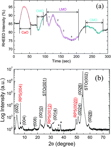 | Fig. 2 (a) RHEED oscillations for one period of the CaO[(CMO)1(LMO)4(CMO)1] superlattice during the middle of the deposition processing and (b) XRD pattern of the resulting [CaO/(CMO)1/(LMO)4/(CMO)1]22 superlattice deposited on a (001) SrTiO3 substrate. The sample is mainly n = 6 RP, with impurity n = 5 RP reflections marked. | ||