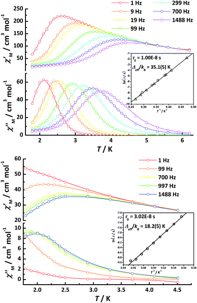 | Fig. 4 Plots of ac susceptibility vs. temperature for 1-Dy (left) and 2-Dy (right) oscillating at 1–1488 Hz at Hac = 5 G and Hdc = 0. Inset: The ln(τ)versus T−1 plots obtained from χM′′(T) (△) and χM′′(ν) (○); The solid lines correspond to the Arrhenius law for 1-Dy (left) and 2-Dy (right). | ||