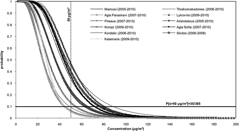 Local authorities develop emission abatement strategies in order to manage air quality in urban areas. Since the concentrations of pollutants are usually random variables influenced by emissions, meteorological conditions and topography, the knowledge of the characteristics of their frequency distribution is important in determining such measures. If the type of the frequency distribution is correctly determined for a pollutant, then the risk of exceeding air quality objectives can be assessed and the necessary emission reductions for attainment of the AQS calculated. Many types of probability distribution functions have been used to describe the distribution of air pollutants, i.e. the lognormal, Weibull, log logistic, Gamma, Beta, Inverse Gaussian, two parameter exponential and Gumbel asymptotic.5–10 In particular for PM the most commonly applied distributions in recent studies are the lognormal, Weibull and Type V Pearson,11–14 whereas high PM values are fitted by the two parameter exponential and Gumbel asymptotic distributions.15–17