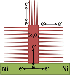 Clearly, the synergistic effect of the nanowire and nanosheet is significant to the capacitance performance in the view of the above phenomena. On one hand, the enhanced capacitance and rate capability of the Co3O4 NSWAs compared with the bare Co3O4 NSAs can be easily understood by introducing more active nanowires. Specifically, the Co3O4 nanowires not only provide new OH– hosts but also increase the specific surface area, resulting in higher capacitance. Moreover, the larger degree of porosity will enhance the electrolyte/Co3O4 contact area and the open space between neighboring NWs allow for easy diffusion of the electrolyte which may lead to high power applications when the sample is charged or discharged at high current,38 in other words, better rate capability can be achieved. On the other hand, the reasons for that the capacitive behavior is still better than Co3O4 NWAs are as following: as schematically demonstrated in Fig. 7, Co3O4 nanowires on nanosheets have an increased portion of exposed surfaces compared to pure Co3O4 NWAs (Fig. 3B) by using Co3O4 NSAs as a roughness substrate. Meanwhile, Co3O4 NSAs play an important role in promoting the conductivity of NSWAs, which improve the utilization of Co3O4 nanowires in the electrochemical process, especially in regions far away from the current collector (e.g. tips). As a result, the composite electrode exhibits higher capacitive performance compared to pure Co3O4 NSAs and NWAs.
