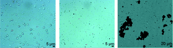 | Fig. 5 Optical micrographs of hybrid films made from (a) f-PMMA, (b) f-PMMA and CNT–COOH–APTES and (c) f-PMMA and CNT–PAH–SiO2. | ||