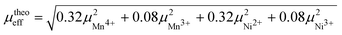 , where the Mn4+/Mn3+ and Ni3+/Ni2+ ratios are taken from the XPS analysis. The consistency between the experimental and the theoretical moment not only confirms that the surface-sensitive XPS results are representative for the bulk material, but also suggests that nearly all the electrons are localized at the magnetic ions and are not itinerant.