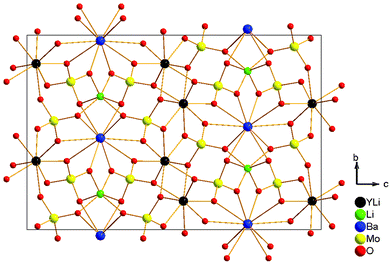 | | Fig. 3 Crystal structure of Li3Ba2Y3(MoO4)8: (a) view of the ab plane showing the layers constructed by Y–LiO8 polyhedrons and MoO4 tetrahedrons; (b) view of the bc plane showing the layered structure. | |