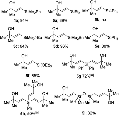 We conducted a competition experiment between propargyl alcohol 1a, but-3-yn-2-ol 1b, and 2-methyl but-3-yn-2-ol 3a where the reaction was conducted with one equivalent of each of the substrates and one equivalent of PhMe2SiH to ascertain the relative rate of reactions. As expected the tertiary alcohol reacted faster than the secondary which in turn was faster than the primary in a krel of 2.7