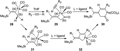 A mechanistic rationale for the PKR was first proposed by Magnus and coworkers in 1985 based upon the precomplexation of Co2(CO)8 with alkyne reagents,27 and this aspect has been broadly applied with additional insights as a general pathway for [2 + 2 + 1] cycloadditions.4a,28 However, our experiments suggest an alternative mechanism resulting from high facial selectivity for the initial complexation leading to the E-alkene geometry of the three-membered metallacycle 28 (Scheme 2). By considering the iron complex 28 as a reactive species for the PKR, we have illustrated two possible pathways leading to cyclopentenone formation. One hypothesis features a stereospecific insertion of carbon monoxide involving bond (b) of 28 which would provide a four-membered intermediate with an open coordination site for alkyne complexation in 29. Subsequent insertion involving bond (a) leads to the acyl metal species 30 for reductive elimination to cyclopentenone product. Alternatively, the loss of carbon monoxide from metallacycle 28 would provide a vacant coordination site for alkyne complexation in 31 followed by selective insertion involving the vinylic bond (a) to produce 32 for conversion to the acyl intermediate 30. In either case, the differential and selective reactions of the allylmetal bond (b) versus the alkenylmetal linkage (a) in 28, in combination with the observed face selectivity for complexation of Fe(CO)4 with the starting allenylsilanes, would suggest new opportunities to explore the chemical behavior of these three-membered metallacycles.