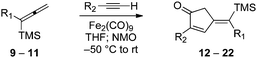 | a Conditions: to a 0.2 M solution of dry THF containing NMO (3.0 equiv.) was added Fe2(CO)9 (1.5 equiv.) and allene (1.0 equiv.) at −50 °C under N2. Alkyne (1.5–3.0 equiv.) was immediately added with stirring for 5 min, and the mixture was then warmed to rt with stirring for an additional 1–3 h. Dilution with hexanes and filtration through a plug of Florisil® was followed by concentration under reduced pressure to give the crude product. b Yields are quoted for major products after purification by flash silica gel chromatography. c Isomer ratios are based on GC-MS analyses of crude products except for entries 6 and 8, where integrations of selected 1H NMR signals were used. | ||||