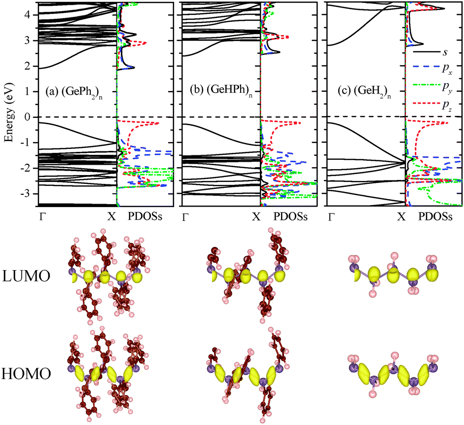 Next, the band structure of (GePh2)n was computed. As shown in Fig. 1(a), it is clear that poly(diphenylgermane) is a semiconductor with a direct bandgap of 2.13 eV at the Γ point. By substituting the phenyl group(s) in (GePh2)n with H atom(s), poly(hydrophenylgermane) (GeHPh)n or poly(dihydrogermane) (GeH2)n is obtained. Their band structures are shown in Fig. 1(b) and (c), respectively. Both exhibit a direct band gap, of 2.72 and 3.03 eV, respectively. Thus, the bandgap can be reduced by several tenths of eV when larger substituents are attached. The band-edge states are mainly contributed by the skeletal Ge atomic orbital (AO). As shown by computed charge density distribution and partial density of states (PDOSs) of Ge atoms (Fig. 1), the lowest unoccupied molecular orbital (LUMO) is mainly contributed by the skeletal Ge 4s and 4px AOs while the highest occupied molecular orbital (HOMO) is composed mainly of Ge 4pz (along the skeletal axis). So the bandgap reduction is relatively small even when the side-chain groups are changed dramatically from H to phenyl, which is similar to that of polysilanes whose band-edge states are mainly contributed by the skeletal Si AOs.31 For (SiXY)n, the bandgap is 4.53, 3.73, and 3.61 eV for XY = H2, HPh, and Ph2, respectively.