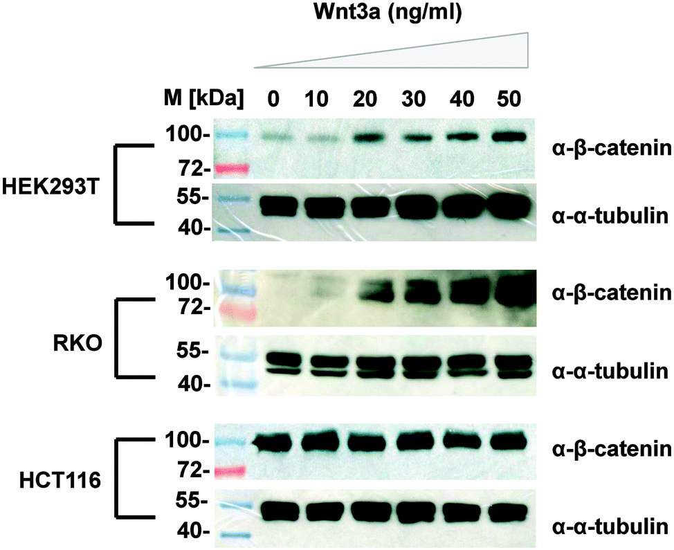 | Fig. 2 Calibrating the Wnt-response in different cell lines (HEK293T, RKO, HCT116). Immunoblots show β-catenin protein expression. Cells were treated with varying doses of Wnt3A (0–50 ng ml−1), incubated for 24 hours and twenty micrograms of total proteins extracted from each cell lysate were subjected to SDS-PAGE followed by immunoblotting with β-catenin antisera or α-tubulin (as loading control). M refers to standard protein marker. | |