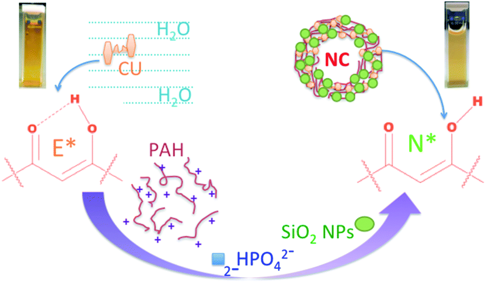 Curcumin associated poly(allylamine hydrochloride) cross-links with dipotassium phosphate and subsequently is assembled with ∼24 nm SiO2 nanoparticles to form hierarchically ordered nanocapsule structures, which are 100–1000 nm in size depending on the concentration of dipotassium phosphate. These structures reverse the excited state intra-molecular hydrogen transfer in curcumin depending on the size of the nanocapsules.