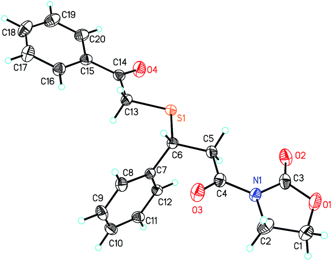 30, flow rate 1.0 mL min−1, detection at 254 nm): tR = 18.1 min (minor enantiomer), tR = 21.7 min (major enantiomer), 78% ee. [α]25D + 47.8 (c 0.26, CH2Cl2). 1H NMR (400 MHz, CDCl3): δ 7.97 (d, J = 7.2 Hz, 2H, ArH), 7.58 (t, J = 7.2 Hz, 1H, ArH), 7.47 (t, J = 7.6 Hz, 2H, ArH), 4.40 (t, J = 8.0 Hz, 2H, CH2), 3.98 (t, J = 8.4 Hz, 2H, CH2), 3.95 (ABq, J = 14.4 Hz, 2H, CH2), 3.45–3.31 (m, 2H, CH + CH2), 3.08 (dd, J1 = 16.4 Hz, J2 = 6.4 Hz, 1H, CH2), 1.38 (d, J = 6.8 Hz, 3H, CH3) ppm. 13C NMR (100 MHz, CDCl3): δ 194.9, 170.7, 153.4, 135.4, 133.3, 128.7, 128.6, 62.1, 42.43, 42.38, 36.9 36.5, 21.4 ppm. IR (KBr): ν 3059, 2962, 2923, 2873, 2850, 1778, 1697, 1597, 1580, 1478, 1388, 1367, 1318, 1277, 1224, 1199, 1132, 1123, 1105, 1075, 1040, 1005, 963, 758, 706, 690, 655, 622, 564 cm−1. HRMS (ESI): m/z calcd for C15H18NO4S [M + H]+ 308.09511, found: 308.09490; C15H17NNaO4S [M + Na]+ 330.07705, found: 330.07689.