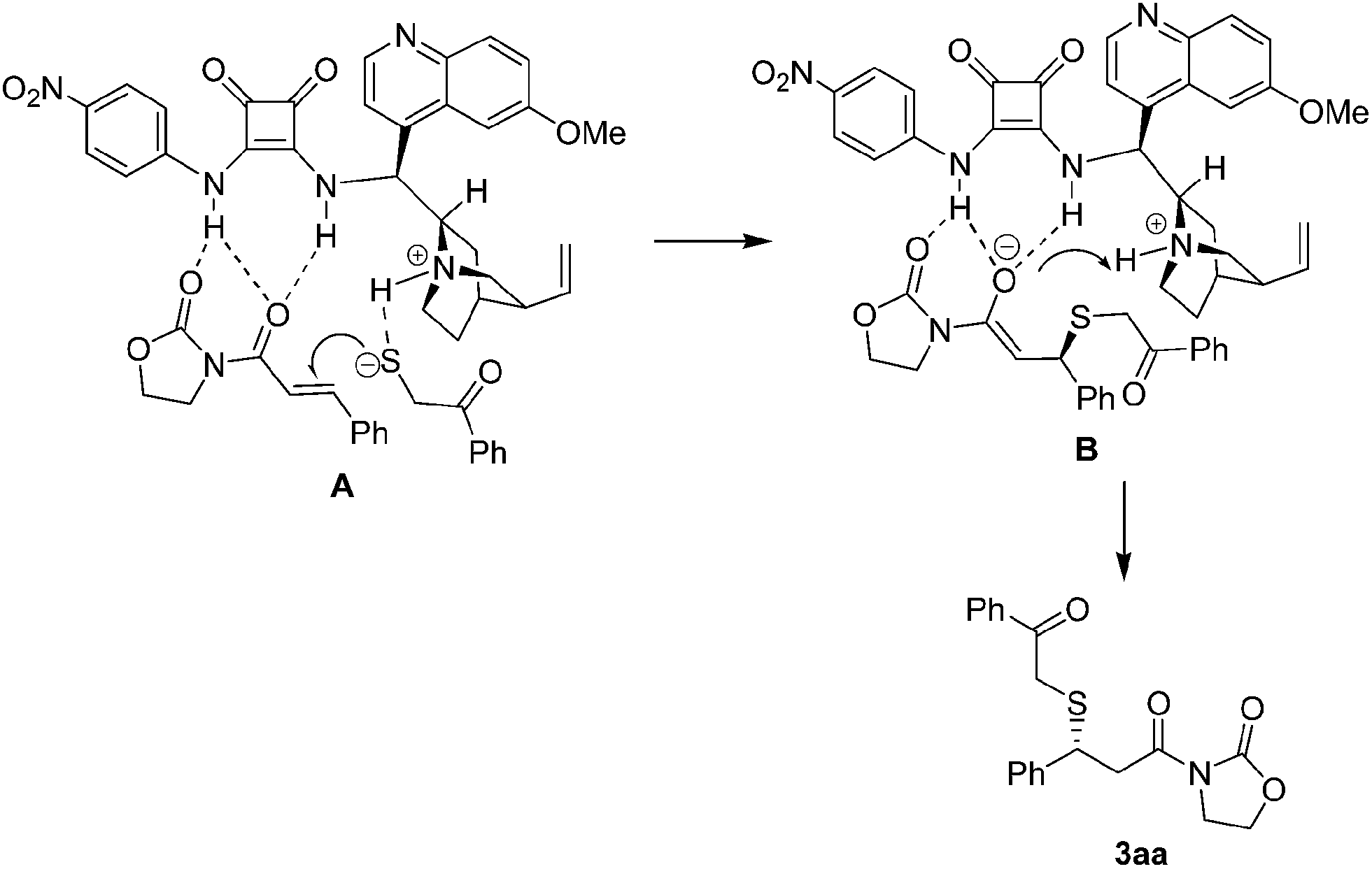 According to the above experimental results and previously similar reports, the substrates involved in the transition state are activated by squaramide VI as proposed in Fig. 3. The N-cinnamoyloxazolidin-2-one is assumed to be activated and oriented by the hydrogen bonds of the squaramide, while the tertiary amine of the catalyst would provide suitable basicity to enhance the nucleophilicity of the α-mercaptoketone. Initially, the anion of α-mercaptoketone attack the N-cinnamoyloxazolidin-2-one from the Re-face via transition state A forming the corresponding Michael adduct anion, subsequent the generated enolate abstract the proton from the quinuclidine nitrogen leads to the formation of the major enantiomer 3aa with (R)-configuration.