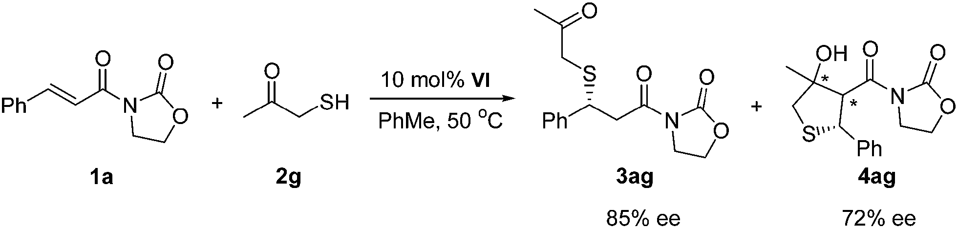 We also try to use the alkyl-substituted α-mercaptoketone (Scheme 1). We carry out the reaction at 50 °C for 48 h because no significant reaction product was observed by TLC at room temperature. The Michael addition product 3ag and Michael/aldol cascade product 4ag were obtained with total 77% yield (these two products can not be separated by column chromatography).