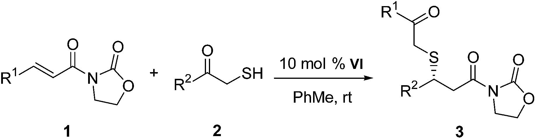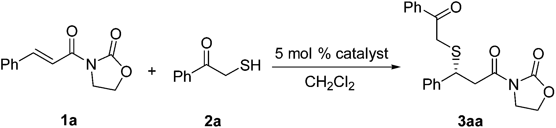 After optimization of the reaction conditions, the asymmetric conjugate addition was extended to other α,β-unsaturated N-acylated oxazolidin-2-ones and various α-mercaptoketones under the optimized same conditions. As summarized in Table 3, in most cases, the desired products were obtained with good to high enantioselectivities. However, the position of the substituent on the aromatic ring of Michael acceptor has an evident effect on enantioselectivity (Table 3, entry 2). When the β-substituted position of 1 was replaced by alkyl group, the yield of the target product decreased significantly (Table 3, entry 9). Heterocyclic-substituted substrates are also well adapted to the reaction (Table 3, entry 8). The electronic nature of the substituent on the aromatic ring of Michael acceptors or donors has little effect on the product enantioselectivity (Table 3, entries 3–6 and 10–14).