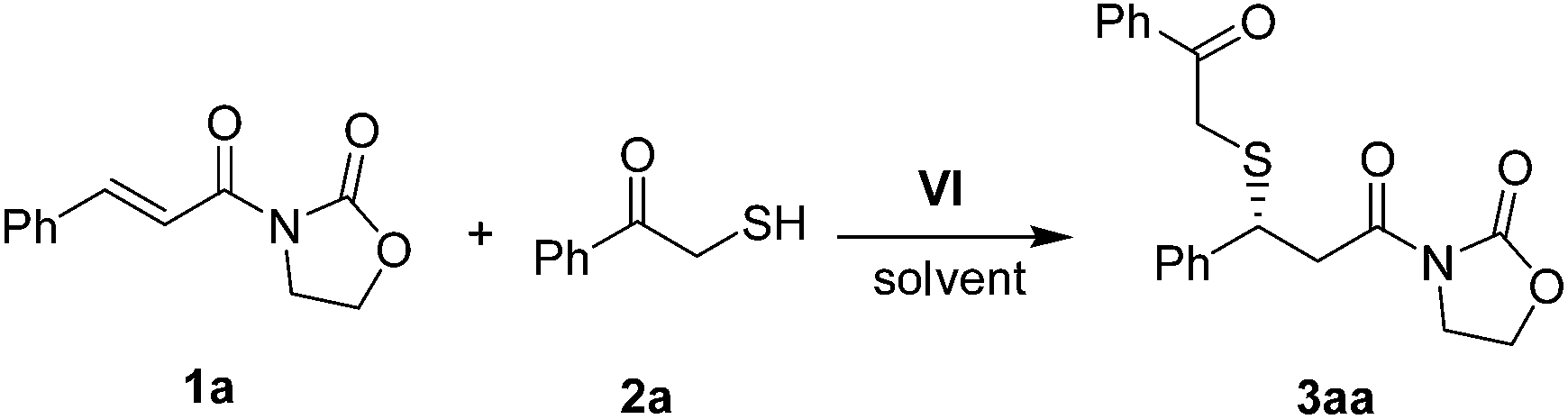 To improve the enantioselectivity of this organocatalytic reaction, we further evaluated effect of various solvents, reaction temperature and catalyst loading using organocatalyst VI as the optimal catalyst. The results are summarized in Table 2. Solvent screening revealed that nonpolar solvents were more suitable for this organocatalysed sulfa-Michael addition (Table 2, entries 1–7), and toluene was the solvent of choice leading to 82% yield and 90% ee (Table 2, entry 4). The reaction was performed at −10 °C lead to a significant drop in enantioselectivity and the loss of chemical yield (Table 2, entry 9), but increasing the reaction temperature to 50 °C did not improve the enantioselectivity as compared with room temperature (Table 2, entry 8 vs. entry 4). Further evaluations revealed that increasing the catalyst loading to 10 mol% could improve the yield (Table 2, entry 10). However, the yield was not significantly improved and the enantioselectivity has a downward trend when increasing the catalyst loading to 15 mol% (Table 2, entry 11). From the above optimization of reaction conditions, the best result was obtained when the reaction was performed at room temperature and the catalyst loading was maintained at 10 mol% (86% yield, 92% ee).